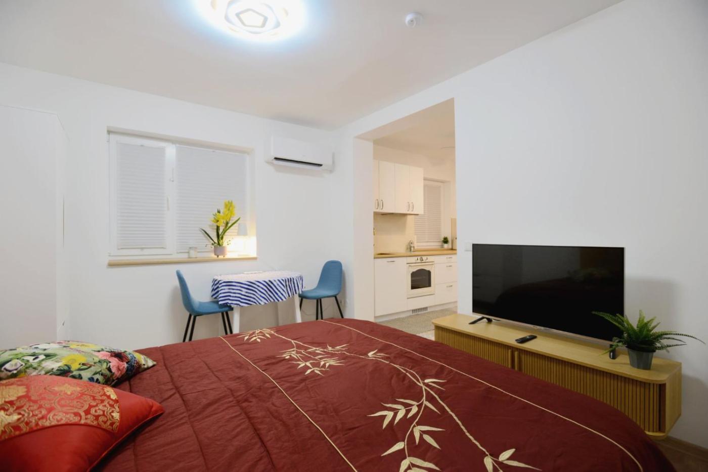 Family Studio. The studio offers a wardrobe and an electric kettle, as well as a private bathroom boasting a shower. Guests can make meals in the kitchen that has a stovetop, a refrigerator, kitchenware and an oven. The studio has parquet floors, a seating area with a flat-screen TV with streaming services, air conditioning, a washing machine, as well as a dining area. The unit has 1 bed and 2 futons.