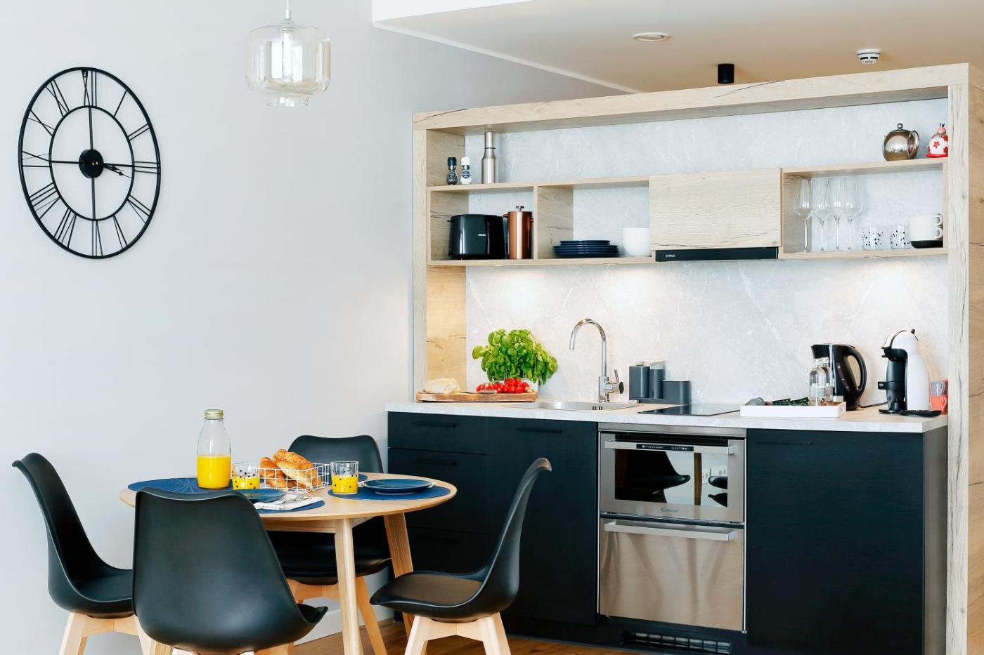 One-Bedroom Apartment. This apartment comprises 1 living room, 1 separate bedroom and 1 bathroom with a walk-in shower and a hairdryer. Meals can be prepared in the kitchen, which comes with a stovetop, a refrigerator, a dishwasher and kitchenware. The apartment features parquet floors, a seating area with a flat-screen TV with streaming services, a washing machine, a coffee machine, as well as a dining area. The unit offers 2 beds.