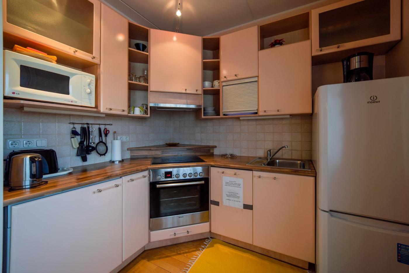 Studio Apartment. A modernly furnished studio apartment decorated in pastel colours. It features a comfortable sofa, a TV with satellite channels, a dining area and a washing machine. There is a kitchenette with a refrigerator and a microwave. The unit is located on the 4th floor in a building with no elevator. It has a view of the Old Town.