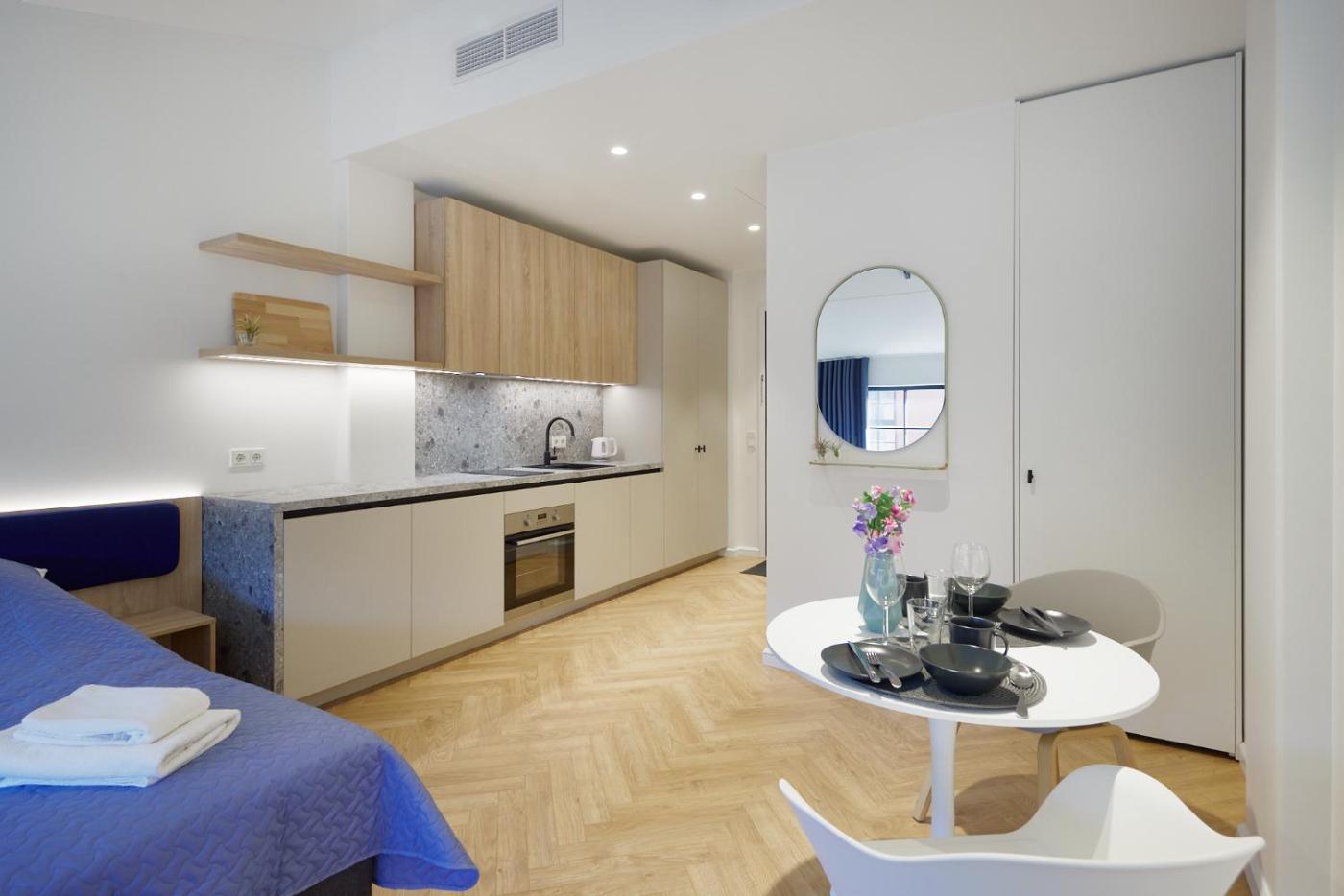 Deluxe Double Studio. The studio features air conditioning, a coffee machine, as well as a private bathroom boasting a walk-in shower and a hairdryer. In the well-fitted kitchen, guests will find a stovetop, a refrigerator, kitchenware and an oven. The studio has parquet floors and provides a dining area, a wardrobe and a quiet street view. The unit has 1 bed. ;