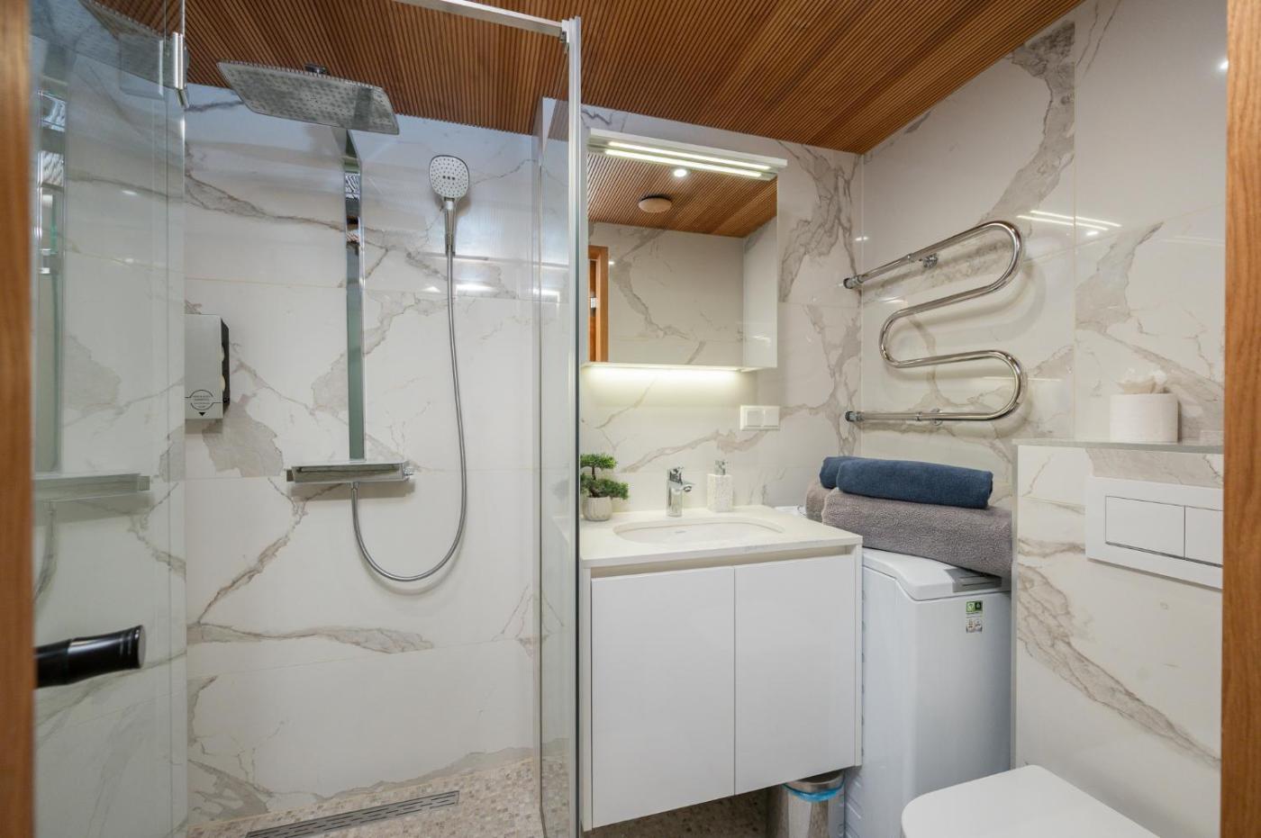 Two-Bedroom Apartment. This apartment offers a sauna. The well-equipped kitchen features a stovetop, a refrigerator, a dishwasher and kitchenware. The spacious apartment provides a washing machine, a dining area, an electric kettle, a flat-screen TV with streaming services, as well as a quiet street view. The unit offers 1 bed.