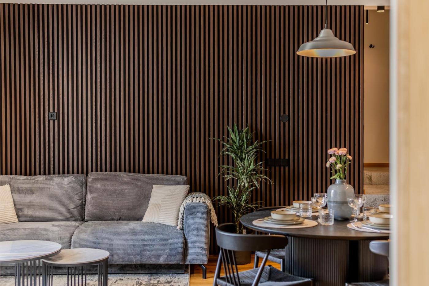 One-Bedroom Apartment. This apartment offers a sauna. This apartment includes 1 living room, 1 separate bedroom and 1 bathroom with a shower and free toiletries. Meals can be prepared in the kitchen, which has a stovetop, a refrigerator, a dishwasher and kitchenware. This apartment has soundproof walls, a tea and coffee maker, flat-screen TV with cable channels, as well as chocolate for guests. The unit has 2 beds.